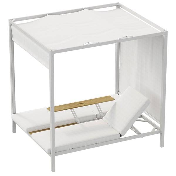 Avec sa structure ouverte, ce lit d’extérieur incarne l’élégance fonctionnelle. Pensé pour deux, il associe la légèreté de l’aluminium à la chaleur du bois pour créer un espace à la fois esthétique et pratique, idéal pour se détendre en bord de mer, de Saint-Tropez à Biarritz.